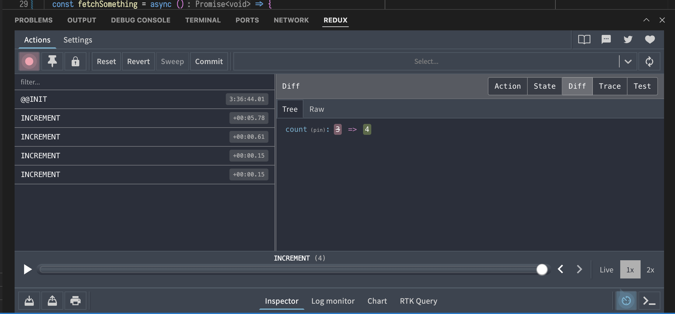 This plugin doesn't require any additional configuration. If your app uses Redux Toolkit, the IDE will automatically detect that, and Redux plugin will be listed in the Dev Tools menu where you can enable it. Once enabled you will be able to use the official Redux UI (same one as the Redux Chrome extension) from within your editor panel:
